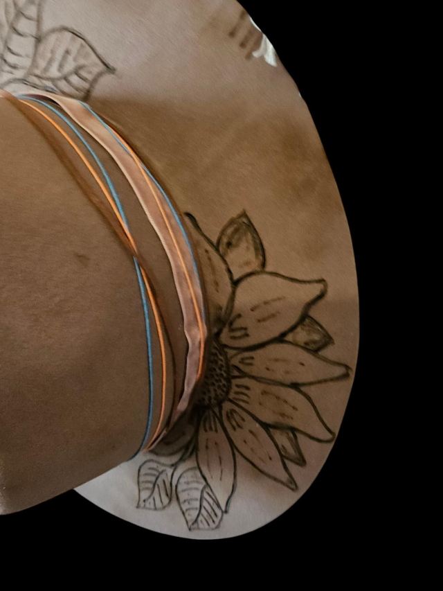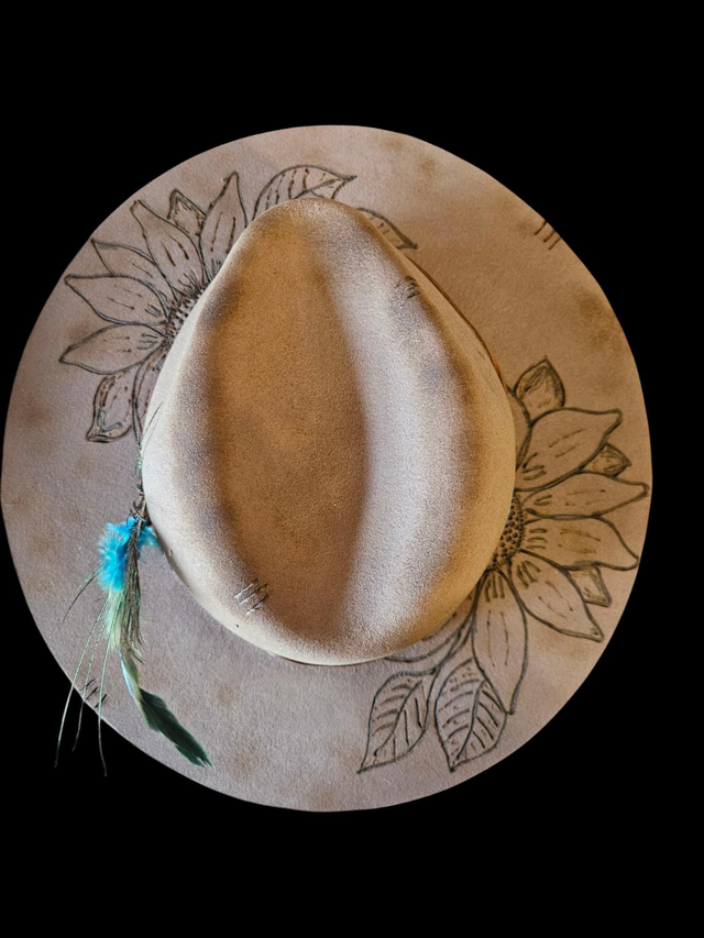 Mushroom colour with hand burnt effect to look worn. Burnt in flower design. Available in 4 sizes, s, m, l, xl (55, 57,59,62.5 approximately)